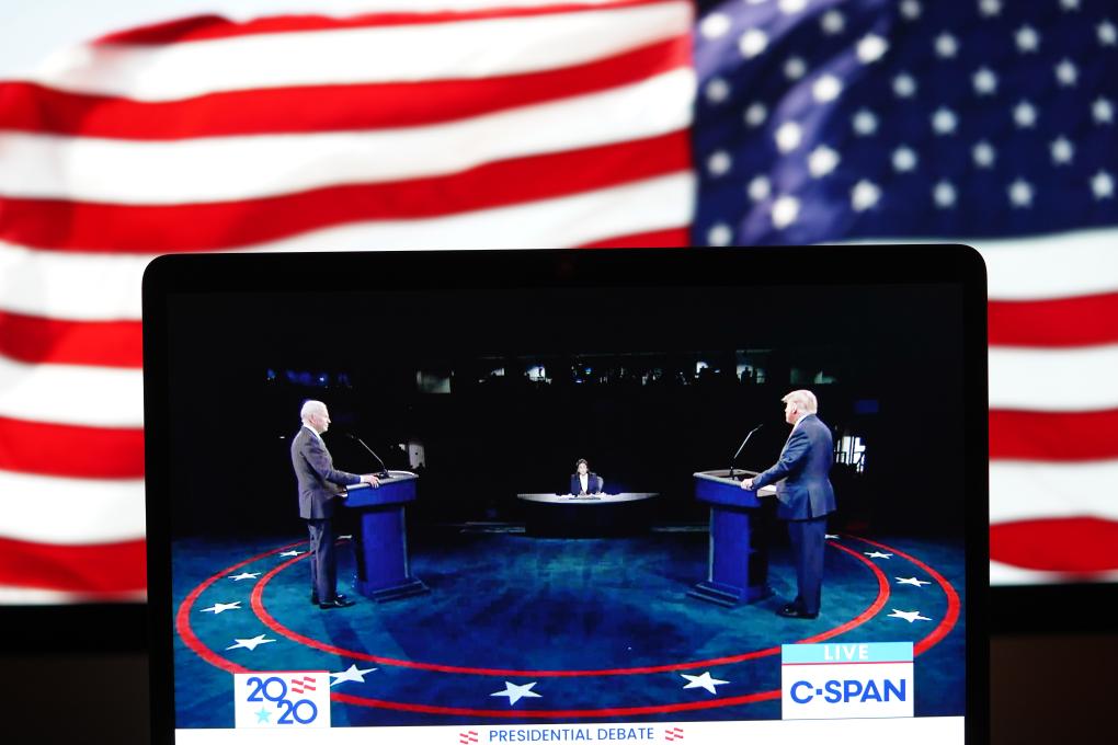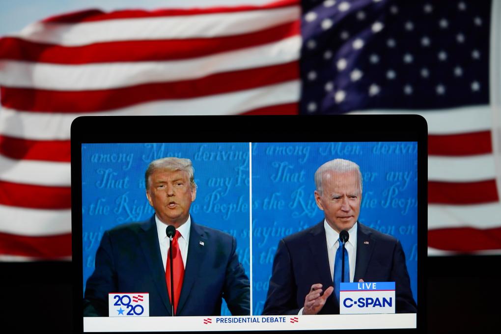 2020年10月22日在美國弗吉尼亞州阿靈頓拍攝的視頻畫面顯示,時任美國總統(tǒng)特朗普(右)與時任民主黨總統(tǒng)候選人拜登(左)在田納西州納什維爾市參加最后一場總統(tǒng)候選人電視辯論。新華社記者劉杰攝