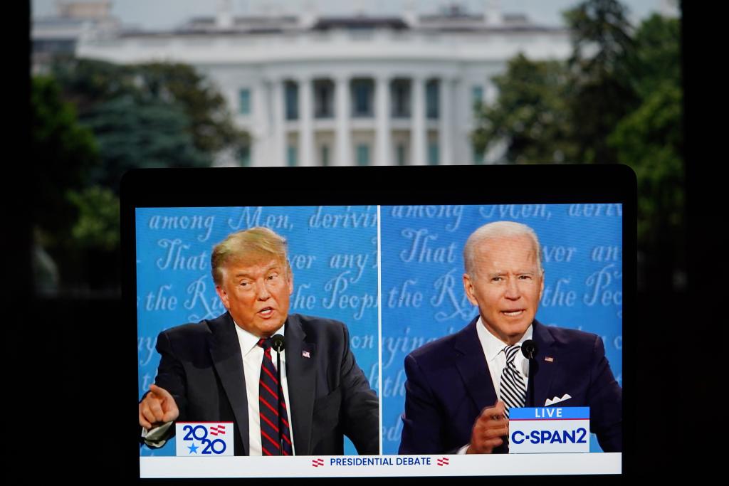 這張2020年9月29日在美國(guó)弗吉尼亞州阿靈頓拍攝的視頻畫面顯示,時(shí)任美國(guó)總統(tǒng)特朗普(左)與時(shí)任美國(guó)民主黨總統(tǒng)候選人拜登在俄亥俄州克利夫蘭市參加2020年美國(guó)總統(tǒng)候選人首場(chǎng)電視辯論。新華社記者 劉杰 攝