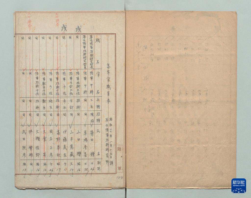 這是日本國(guó)立公文書館藏《陸軍第九陸軍技術(shù)研究所高等官職員表(1945年8月15日制)》原始檔案首頁。新華社發(fā)(受訪者供圖)