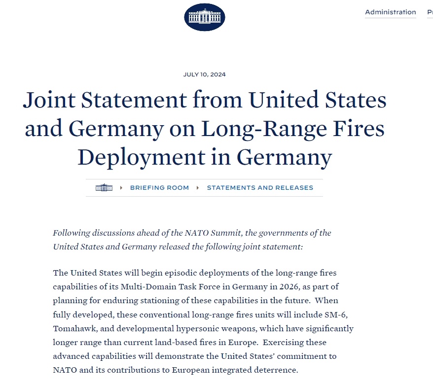 在上周的北約華盛頓峰會(huì)期間,美國和德國聯(lián)合宣布,作為長期規(guī)劃的一部分,美國將從2026年開始分階段在德國部署遠(yuǎn)程武器。