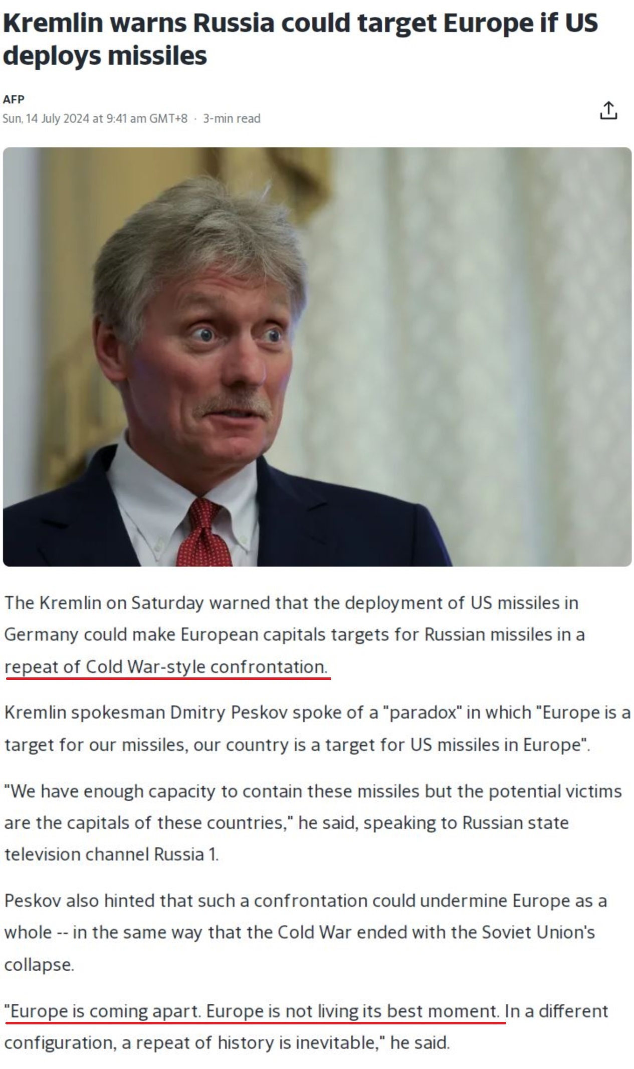 佩斯科夫警告,美國的最新舉動(dòng)可能會(huì)讓歐洲“重演冷戰(zhàn)式對抗”,“歐洲正在分崩離析。對歐洲來說,這絕不是最好的時(shí)刻”。