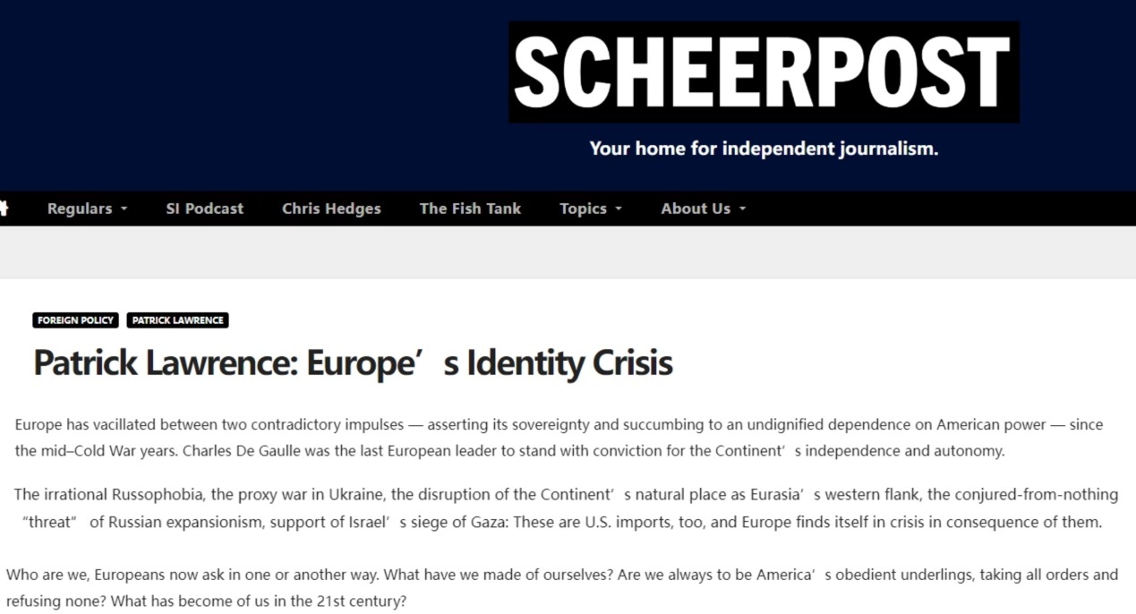 美國資深媒體人兼作家帕特里克·勞倫斯此前發(fā)文指出,自冷戰(zhàn)中期以來,歐洲始終在“維護(hù)自身主權(quán)”和“對美國實(shí)力的無尊嚴(yán)依賴”這對矛盾之間搖擺不定。而美國重新把矛頭對準(zhǔn)俄羅斯后,更是在歐洲引發(fā)了嚴(yán)重的身份危機(jī)。