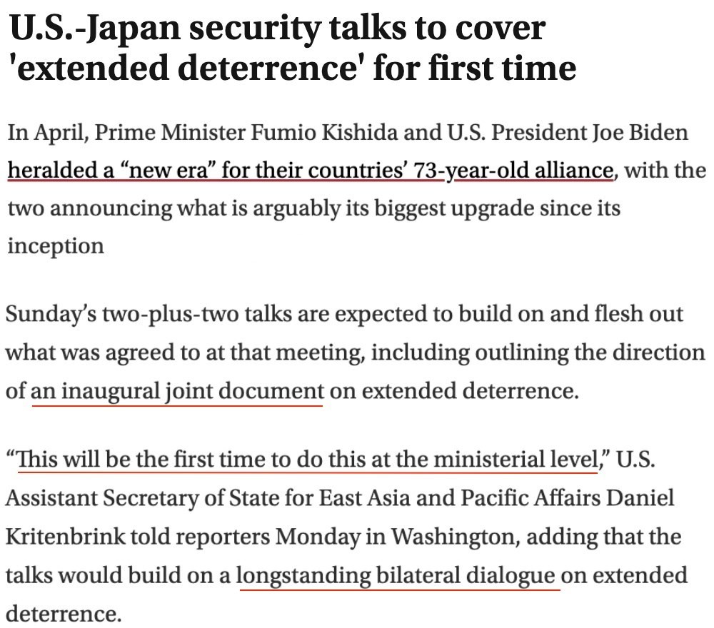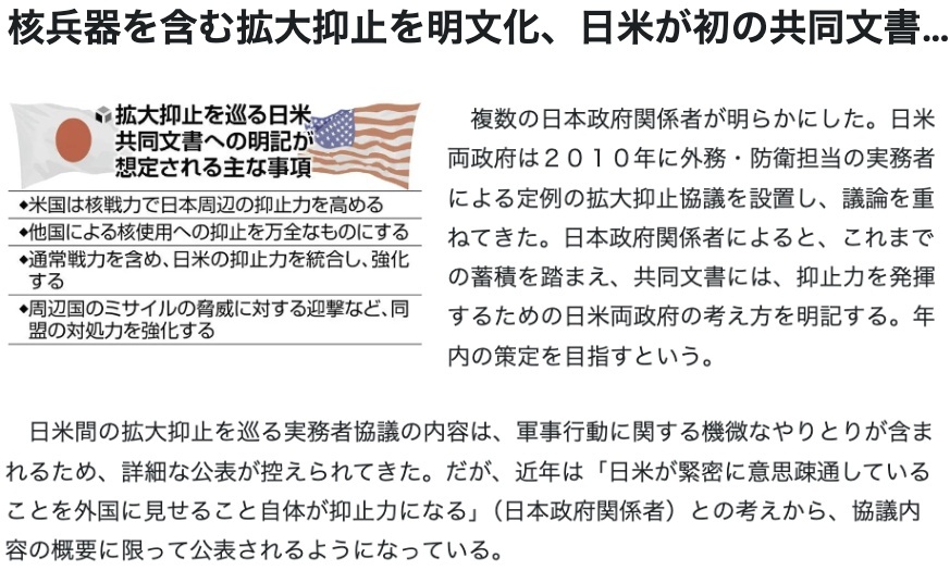 日本《讀賣新聞》援引未具名日本政府消息人士的話報道稱,日美兩國的目標是在今年年內(nèi)出臺關(guān)于“延伸威懾”的首份聯(lián)合文件,其中將清楚地闡明“美國堅定不移捍衛(wèi)日本”的承諾。