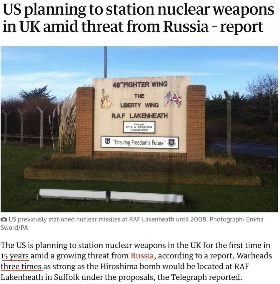 △英國《衛(wèi)報》:英國薩福克郡拉肯希思皇家空軍基地新設(shè)施的采購合同證實,美國打算在該空軍基地部署三倍于轟炸廣島原子彈威力的核彈頭。
