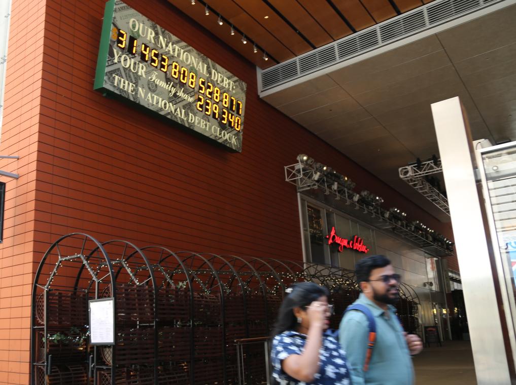 2023年5月29日,人們經(jīng)過美國紐約曼哈頓的“國債鐘”?!皣鴤姟笔且粋€大型計數(shù)器,它實時更新美國的公共債務(wù)總額,并顯示出每個美國家庭所要負擔(dān)的數(shù)額。 新華社記者劉亞南攝