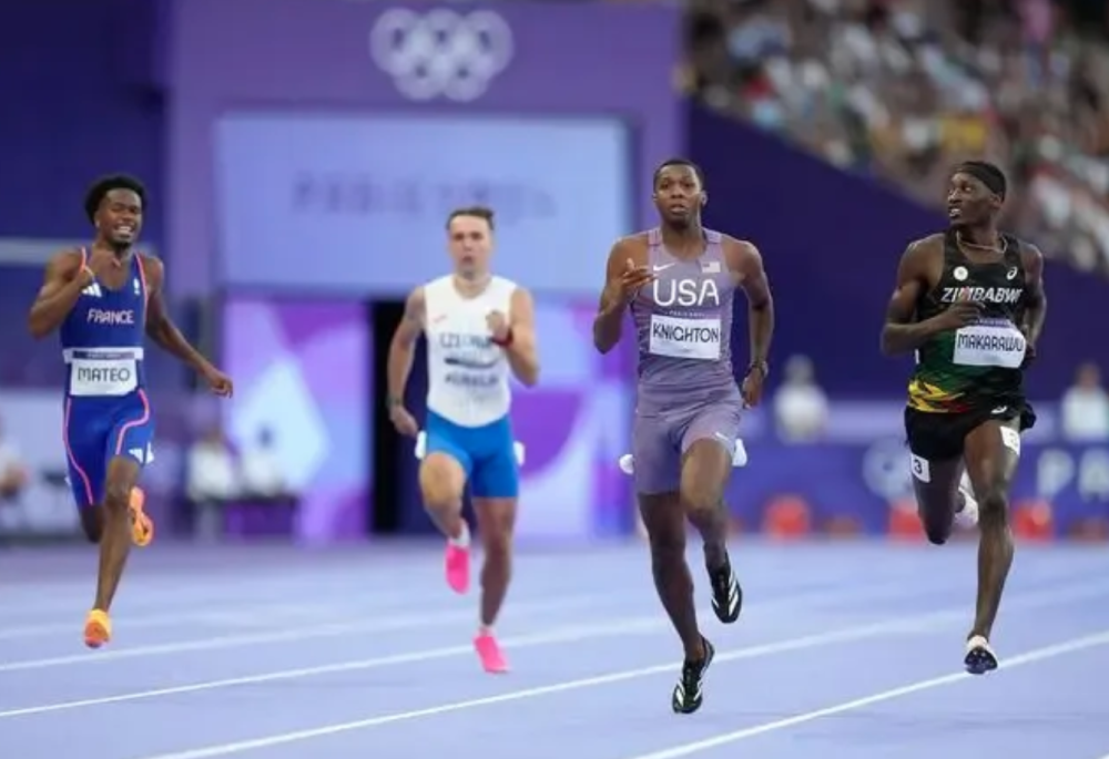 2024年8月5日,美國選手奈頓(右二)在比賽中。當(dāng)日,巴黎奧運(yùn)會(huì)田徑男子200米第一輪比賽在法蘭西體育場舉行。新華社記者 呂小煒 攝