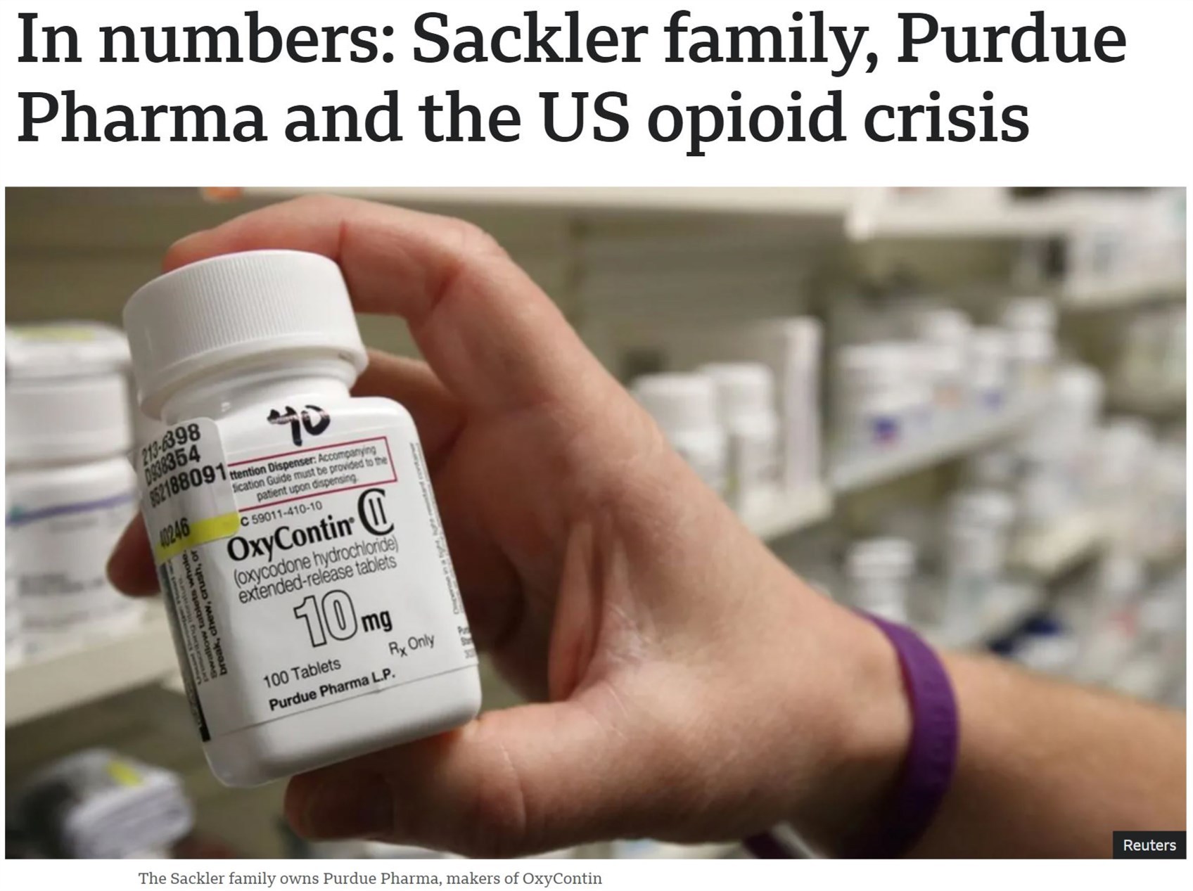 1996年,薩克勒家族旗下的普渡制藥公司研發(fā)出了新型止痛藥——奧施康定。這一新藥極易造成藥物上癮,但薩克勒家族卻與美國(guó)食品藥品監(jiān)督管理局勾結(jié),隱瞞該藥品的成癮性,靠大規(guī)模地宣傳、分銷奧施康定發(fā)家,在20年的時(shí)間里積累了數(shù)百億美元的資產(chǎn)。與此同時(shí),奧施康定卻導(dǎo)致700萬(wàn)人成癮,50萬(wàn)人死亡,大批病人精神抑郁,甚至走上犯罪道路。