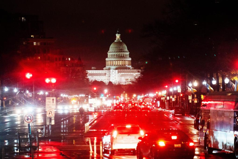 這是2022年12月22日在美國(guó)華盛頓拍攝的雨中的車(chē)輛和國(guó)會(huì)大廈。新華社記者劉杰攝