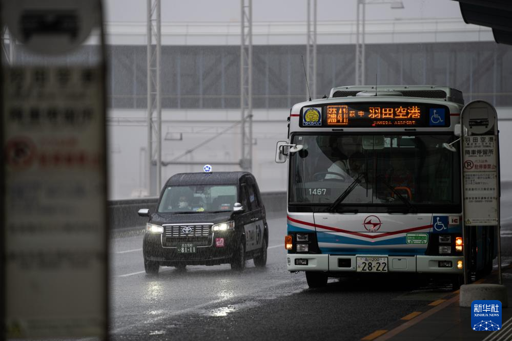 8月16日,在日本東京羽田機(jī)場(chǎng),車輛行駛在暴雨中。新華社記者 張笑宇 攝