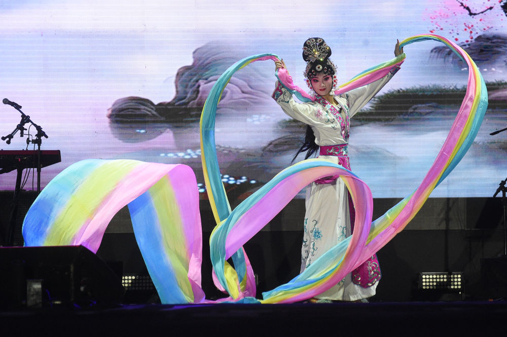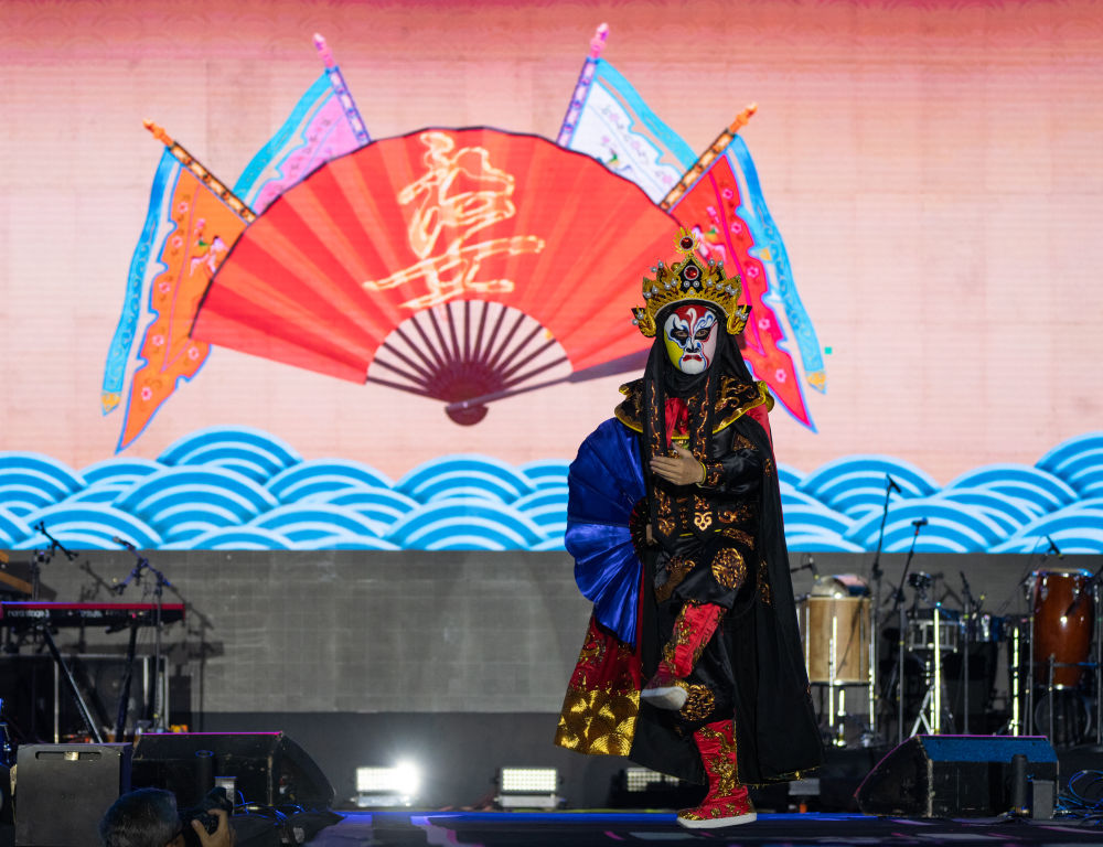 ↑8月17日,在巴西首都巴西利亞,來自浙江婺劇藝術(shù)研究院的演員在沙灘藝術(shù)節(jié)中國日活動上表演。