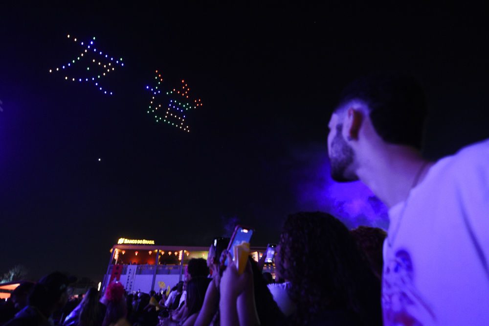 ↑8月17日,在巴西首都巴西利亞,人們在沙灘藝術(shù)節(jié)中國日活動上觀看無人機(jī)表演。