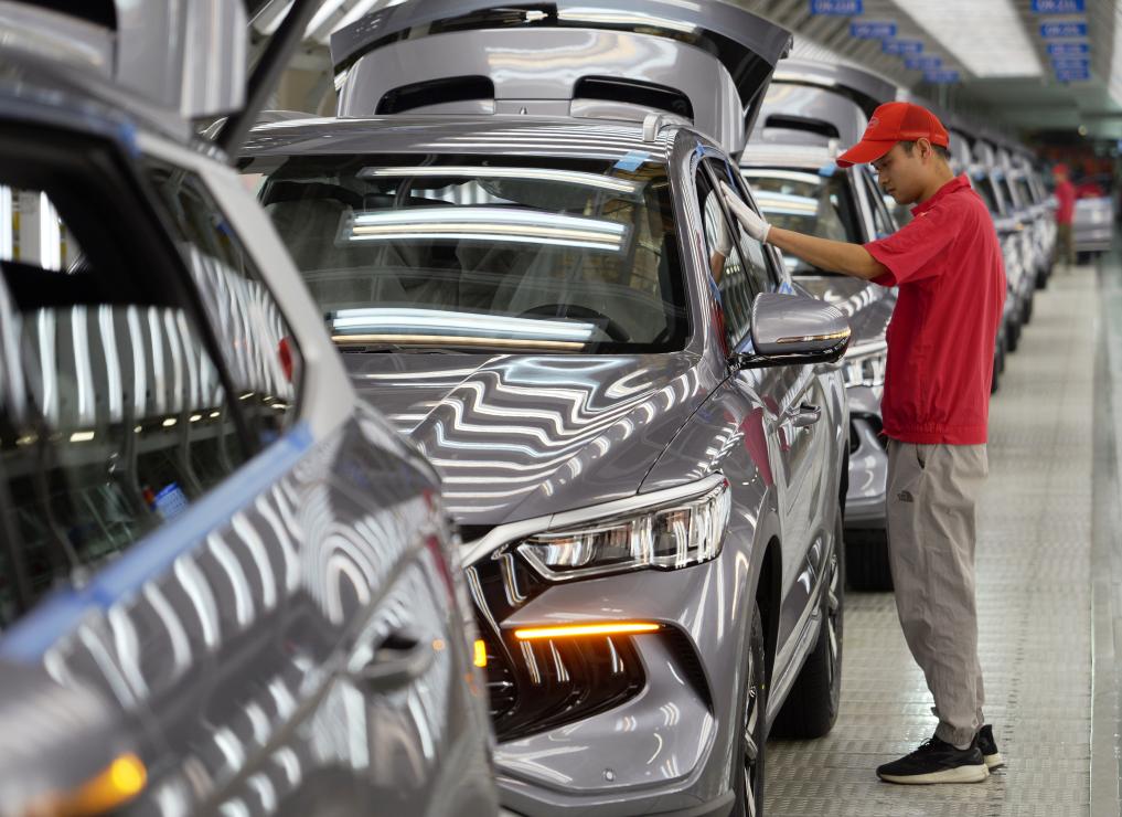2024年4月24日,工人在位于河南省鄭州市的鄭州航空港區(qū)比亞迪總裝工廠(chǎng)新能源汽車(chē)“宋Pro”生產(chǎn)線(xiàn)上對(duì)車(chē)輛進(jìn)行質(zhì)檢。新華社記者李嘉南攝