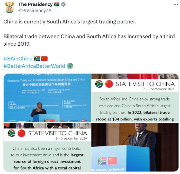 南非總統(tǒng)官方賬號(hào)也在峰會(huì)期間發(fā)文稱,中國目前是南非最大的貿(mào)易伙伴,南非和中國擁有充滿活力、多元和不斷增長的經(jīng)濟(jì),能夠?yàn)橄M_拓新市場的企業(yè)提供豐富機(jī)遇。