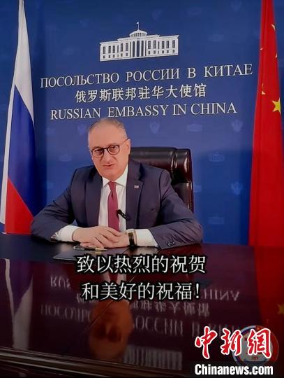 圖為俄羅斯駐華大使莫爾古洛夫發(fā)表視頻賀辭截圖。俄羅斯駐華大使館供圖。