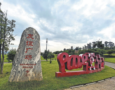 鐫刻著“友誼廣場(chǎng)”幾個(gè)中文大字的泰山石碑矗立在半山坡一片平地上。