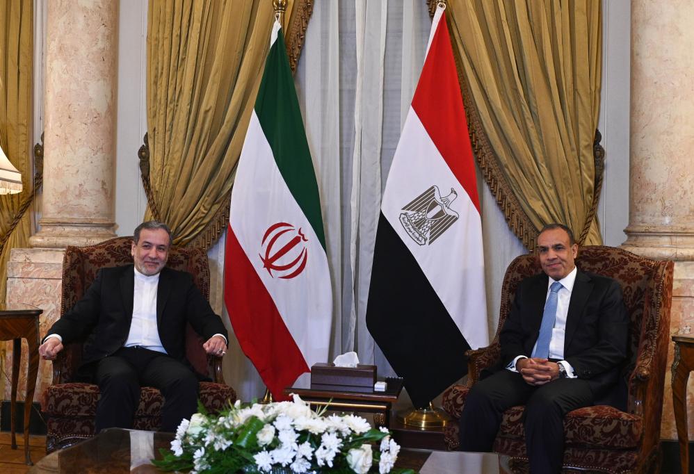 10月17日,埃及外長(zhǎng)阿卜杜勒阿提(右)在首都開(kāi)羅會(huì)見(jiàn)來(lái)訪(fǎng)的伊朗外長(zhǎng)阿拉格齊。新華社發(fā)(賽義德·穆罕默德攝)