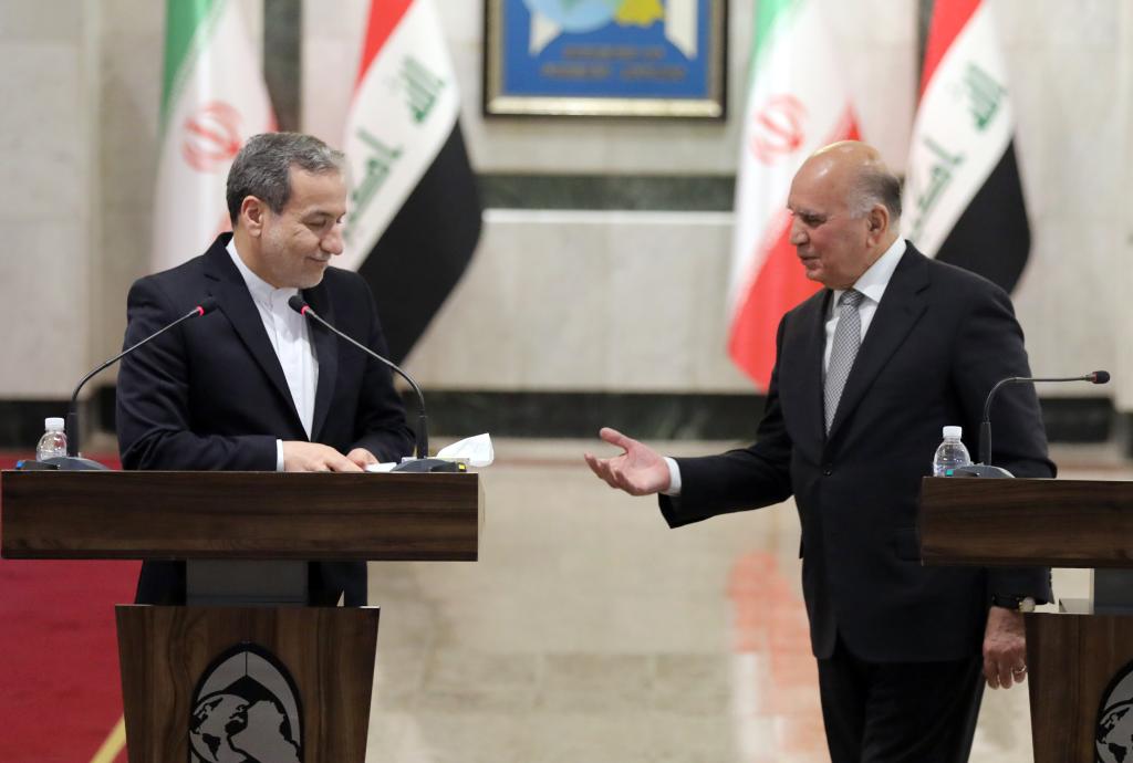 10月13日,伊拉克外長(zhǎng)侯賽因(右)同到訪(fǎng)的伊朗外長(zhǎng)阿拉格齊在首都巴格達(dá)舉行會(huì)談后參加聯(lián)合記者會(huì)。新華社發(fā)(哈利勒·達(dá)伍德攝)