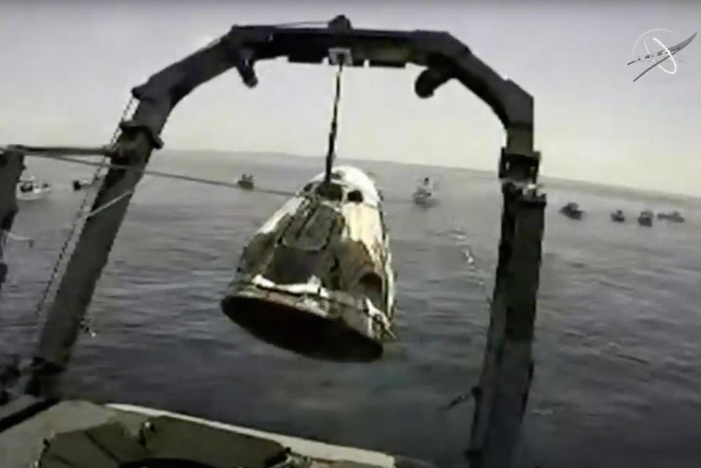這張美國航天局2020年8月2日發(fā)布的視頻截圖顯示,回收船在美國東南部佛羅里達州附近的墨西哥灣打撈太空探索技術公司“龍”飛船。新華社發(fā)(美國航天局供圖)