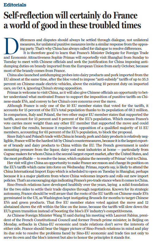 歐盟投票表決時(shí),法國(guó)支持對(duì)中國(guó)電動(dòng)汽車(chē)加征懲罰性關(guān)稅。普里馬斯此次訪華,將讓中方進(jìn)一步了解法國(guó)的動(dòng)機(jī),同時(shí)傳達(dá)中方關(guān)切。