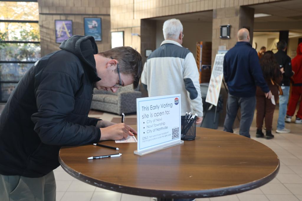 10月28日,在美國密歇根州奧克蘭縣諾維,一名男子在投票站填寫資料準(zhǔn)備參加提前投票。新華社記者 徐劍梅 攝