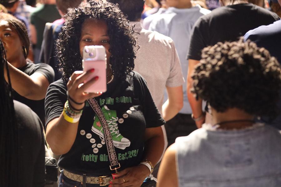 2024年10月25日,美國(guó)民主黨總統(tǒng)候選人哈里斯在得克薩斯州休斯敦舉行競(jìng)選集會(huì),聚焦女性生育自主權(quán)。這是一名女子在集會(huì)上自拍。新華社記者徐劍梅攝