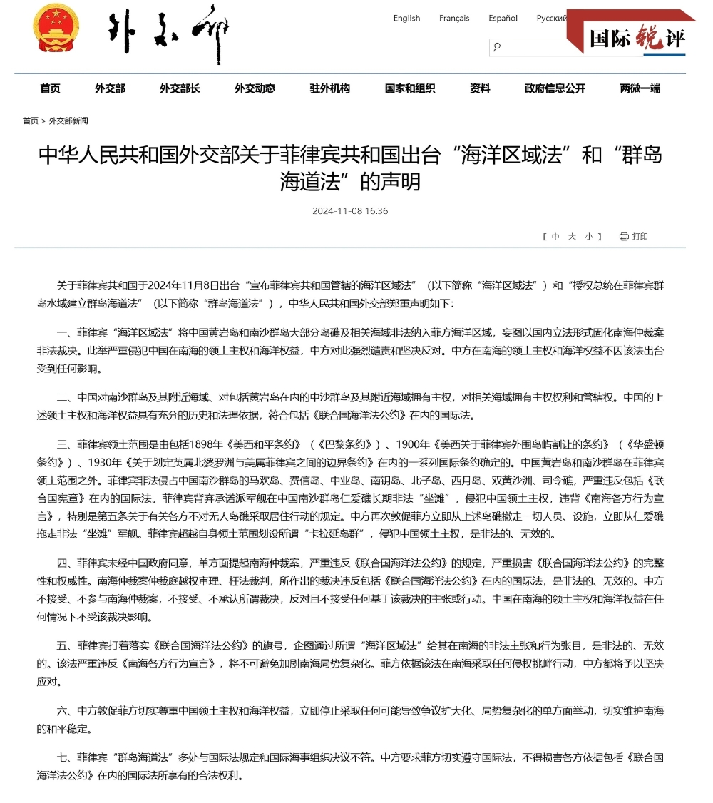 第三,菲方將中國黃巖島和南沙群島大部分島礁及相關(guān)海域納入主張管轄的范圍,延續(xù)了長期以來以國內(nèi)立法擴(kuò)張領(lǐng)土的劣行,與“陸地統(tǒng)治海洋”的國際法基本原則背道而馳。至于所謂《群島海道法案》,多處與國際法規(guī)定和國際海事組織決議不符。比如將海道通過權(quán)同南海爭端掛鉤,限制他國船舶、飛機(jī)正當(dāng)通過權(quán),違背《公約》規(guī)定,將破壞海洋自由和航行自由。