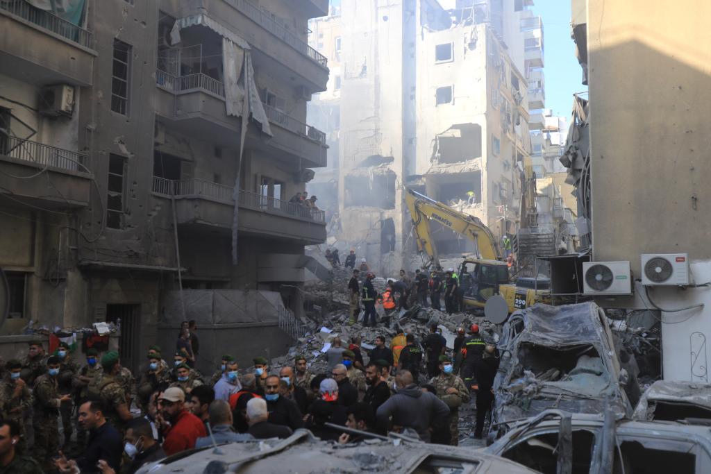 11月23日,在黎巴嫩貝魯特,人們?cè)谠庖攒娍找u的建筑廢墟參與搜救。新華社發(fā)