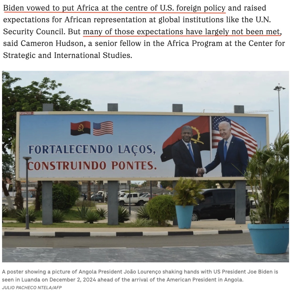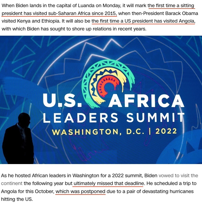△美國有線電視新聞網(wǎng)報道:這是一場拖了太久的訪問。2022年在華盛頓舉行的美非峰會上,拜登曾承諾2023年訪問非洲,但他食言了。即便是這次原本安排在10月的安哥拉之行也因美國國內發(fā)生颶風災害而推遲。