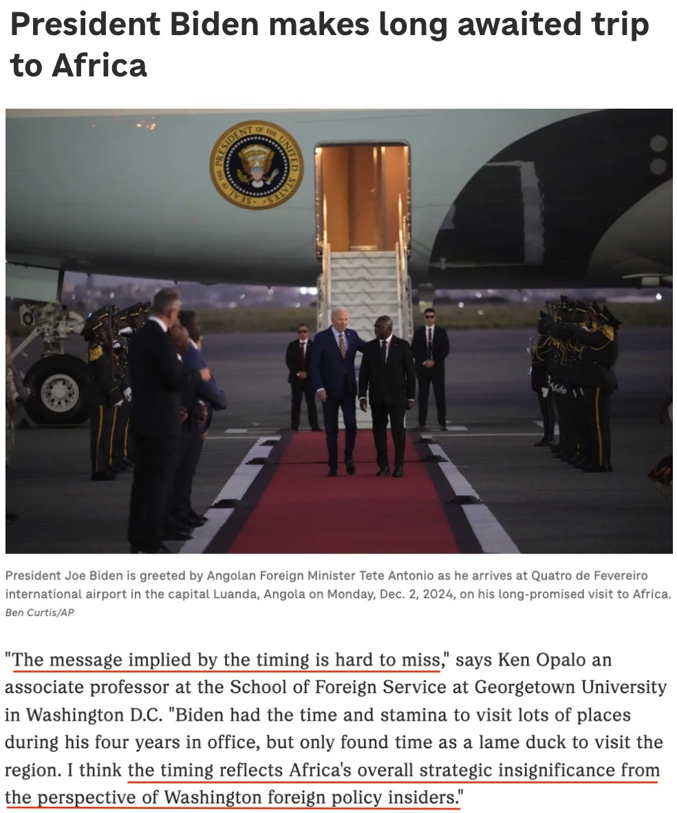 美國華盛頓特區(qū)喬治城大學外交學院副教授肯·奧帕羅認為,拜登在即將卸任時才抽出時間訪問非洲地區(qū),“從華盛頓外交政策內部人士的角度來看,這個時機反映了非洲在美國總體戰(zhàn)略中的不重要性”。