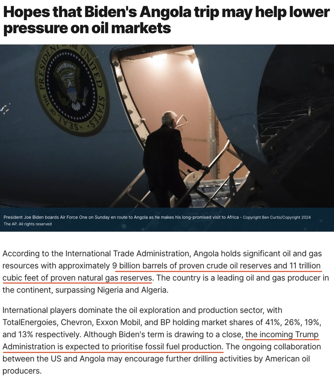 雖然拜登的任期即將結束,但預計即將上任的特朗普政府將優(yōu)先考慮化石燃料生產(chǎn)。美國和安哥拉之間正在進行的合作可能會鼓勵美國石油生產(chǎn)商進一步開展鉆探活動。