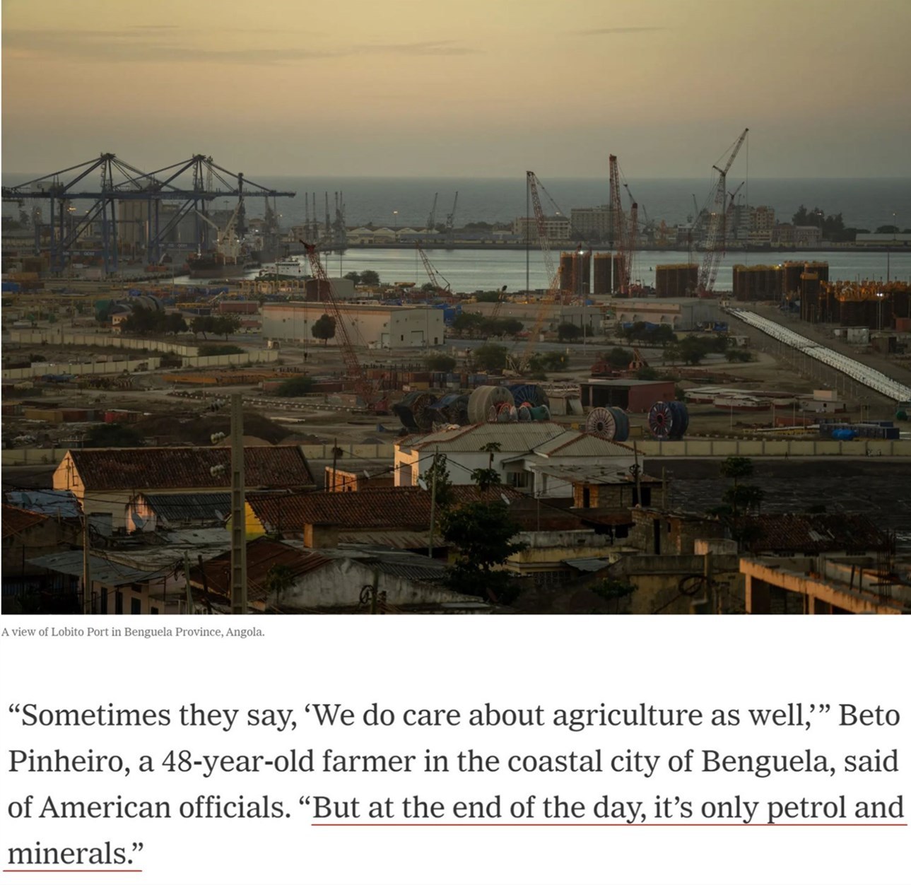 家住安哥拉沿海城市本格拉的48歲農民貝托·皮涅羅說:“有時他們(美國官員)會說,‘我們也關心(安哥拉的)農業(yè)’……但歸根結底,(美國關心的)只有石油和礦產(chǎn)?!?/p>