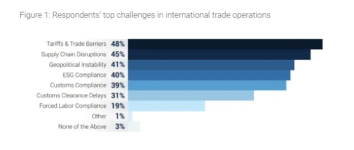 調(diào)查顯示,48%的受訪者認(rèn)為關(guān)稅和貿(mào)易壁壘上升是他們最擔(dān)心的問題,緊隨其后的是供應(yīng)鏈中斷(45%)和地緣政治不穩(wěn)定(41%)。此外,無論所在公司規(guī)模大小,受訪者都將關(guān)稅和貿(mào)易壁壘列為當(dāng)前面臨的首要問題。這項(xiàng)報告共調(diào)查了978名來自歐洲、北美、南美和亞太地區(qū)主要貿(mào)易國的供應(yīng)鏈領(lǐng)域領(lǐng)導(dǎo)者。