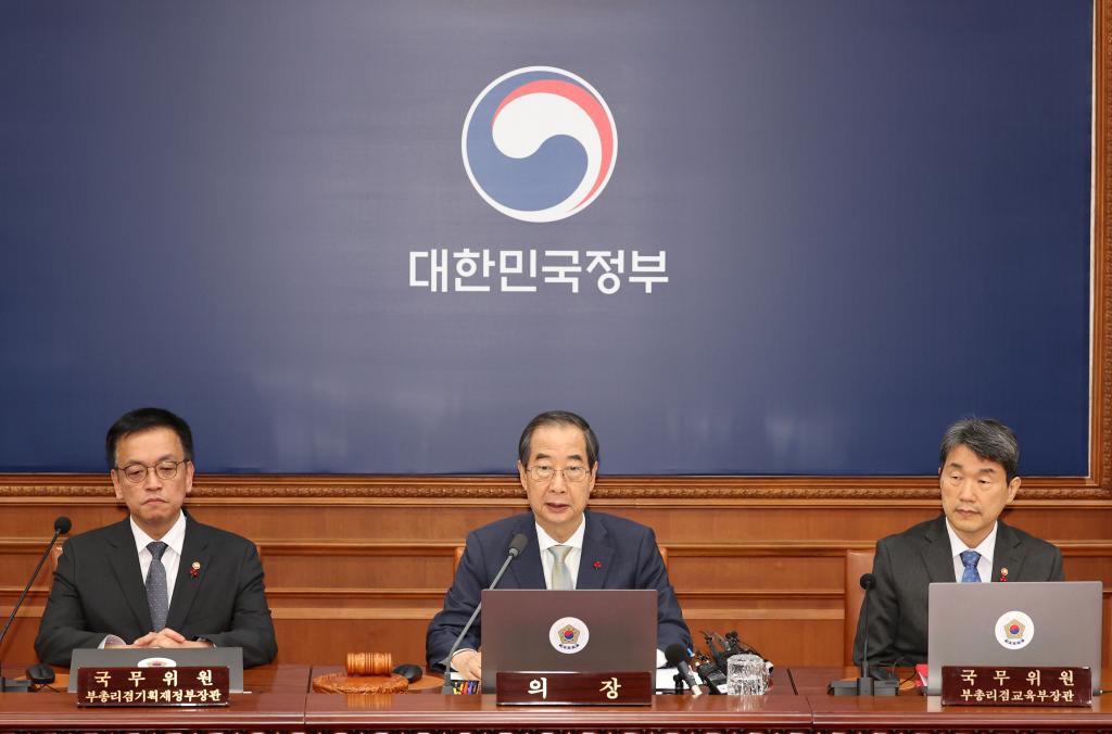 12月14日,在韓國首都首爾,代行總統(tǒng)職權(quán)的韓國國務(wù)總理韓德洙(中)召開臨時(shí)國務(wù)會(huì)議。新華社/紐西斯通訊社