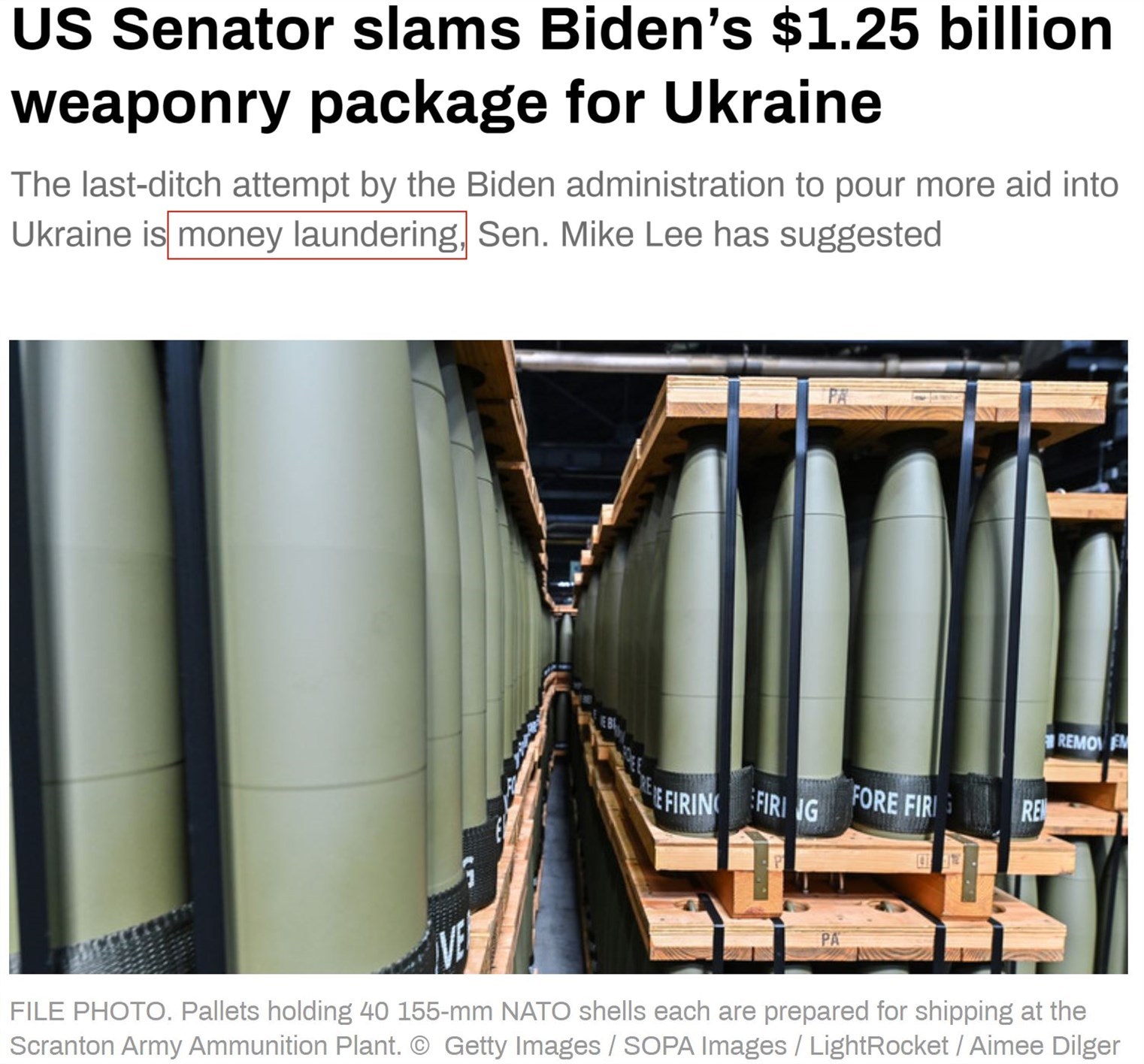 “今日俄羅斯”電視臺報道稱,參議員邁克·李認(rèn)為,拜登政府向烏克蘭提供新的“豪華武器包”的提議是“洗錢”行為。