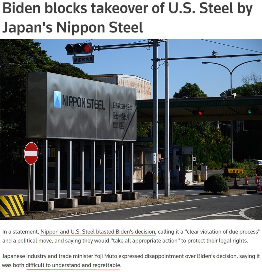 雖然日鐵多次讓步,但美國總統(tǒng)拜登當?shù)貢r間3日發(fā)表聲明,正式阻止了這筆價值2萬億日元(按目前匯率約合127億美元)的交易。