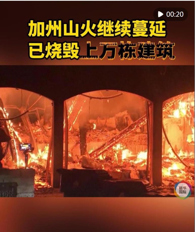 名為“伊頓”和“帕利塞茲”的兩處最大規(guī)模山火在洛杉磯縣東西兩側(cè)肆虐?!耙令D”大火已燒毀超7000棟建筑,致死11人。“帕利塞茲”大火已燒毀超5300棟建筑,致死5人,并在向更多社區(qū)蔓延。