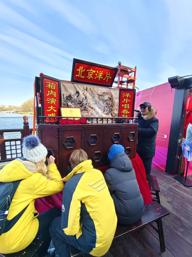 走入北京歷史文化街區(qū)什剎海的新春集市,年味彌漫在文化產(chǎn)品、特色小吃和藝術(shù)表演中。不遠(yuǎn)處的鑼鼓唱戲聲吸引了母子二人,原來(lái)是民間藝術(shù)北京洋片在表演《西游記》。坐在一個(gè)約1米高、2米寬的木箱前,透過(guò)箱上圓孔能看到里面不斷切換的畫(huà)片。二人全神貫注的表情,讓人感到不同文化仿佛跨越時(shí)空和國(guó)度,在這里定格。