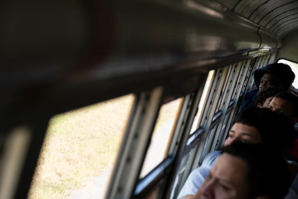 2月14日,在洪都拉斯西北部城市圣佩德羅蘇拉,返鄉(xiāng)移民乘坐返鄉(xiāng)移民援助中心的巴士前往車站。新華社發(fā)(戴維 攝)