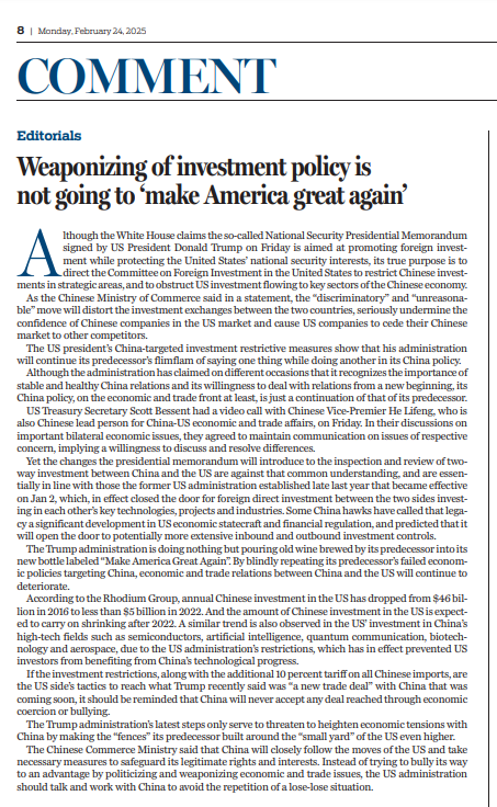 上周五(2月21日),美國總統(tǒng)特朗普簽署所謂的“國家安全總統(tǒng)備忘錄”(下稱“備忘錄”)。白宮稱,該備忘錄旨在鼓勵外來投資的同時,保護美國國家安全利益。然而,其真實目的是責(zé)令美國外國投資委員會限制中國對美國關(guān)鍵領(lǐng)域投資,并妨礙美國對中國關(guān)鍵領(lǐng)域投資。