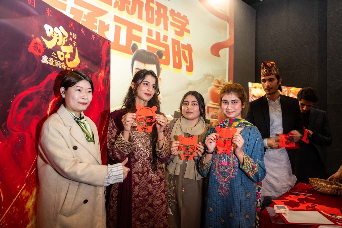 2月25日,在長(zhǎng)沙摩天輪國(guó)際影城,留學(xué)生們?cè)谡故尽澳倪浮奔艏堊髌?。(圖片來源:新華社)