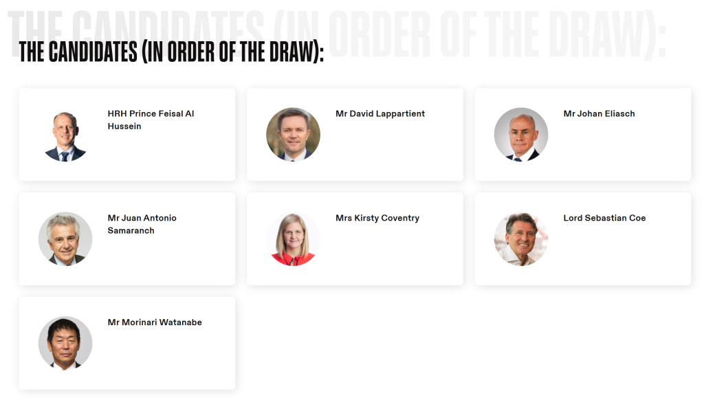 此次國際奧委會主席選舉共有創(chuàng)紀錄的七人參與,包括國際奧委會副主席小薩馬蘭奇,國際奧委會執(zhí)委、運動員委員會前主席柯絲蒂·考文垂,世界田聯(lián)主席塞巴斯蒂安·科,國際自行車聯(lián)盟主席大衛(wèi)·拉帕爾蒂安,國際雪聯(lián)主席約翰·埃利亞施,國際奧委會執(zhí)委費薩爾·侯賽因和國際體操聯(lián)合會主席渡邊守成。