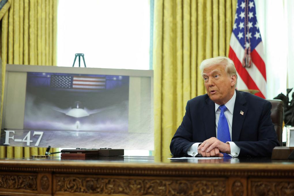 3月21日,美國總統(tǒng)特朗普在白宮一場活動(dòng)中發(fā)表講話并展示F-47戰(zhàn)斗機(jī)圖像。新華社/美聯(lián)