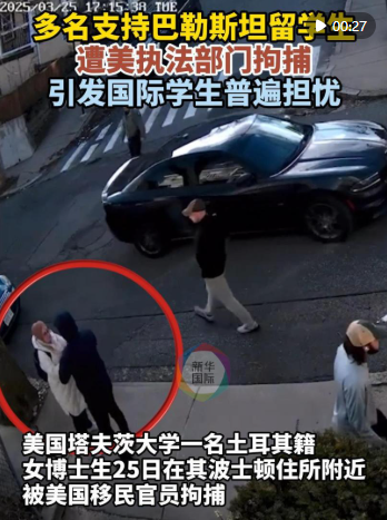 新華社北京3月28日電 據(jù)美國媒體報道,塔夫茨大學(xué)土耳其籍博士生魯梅伊莎·厄茲蒂爾克25日在其波士頓住所附近遭美國移民官員拘捕。自唐納德·特朗普就任總統(tǒng)以來,已有多名在美外國留學(xué)生因支持巴勒斯坦而遭拘捕或被驅(qū)逐出境。