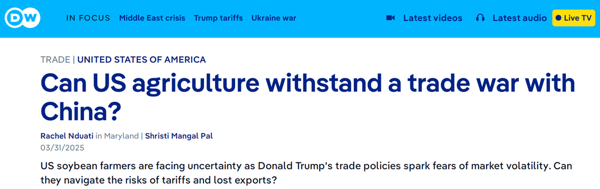 德國之聲3月31日報道稱,特朗普的貿(mào)易政策引發(fā)市場動蕩擔(dān)憂,美國大豆種植戶面臨巨大的不確定性。美國大豆出口,特別是對華出口,多年來一直在下降。特朗普貿(mào)易政策對農(nóng)民的全面影響可能要等到下一個收獲季才會完全顯現(xiàn)。
