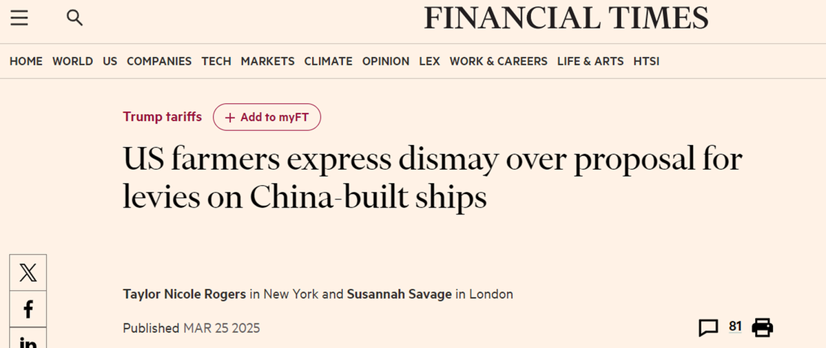 另據(jù)英國《金融時報》報道,美國中西部農(nóng)民非常擔(dān)憂,加征“港口費”必將進一步削弱農(nóng)產(chǎn)品出口競爭力。美國大豆出口委員會首席執(zhí)行官吉姆·薩特表示,整個行業(yè)對提案“措手不及”。