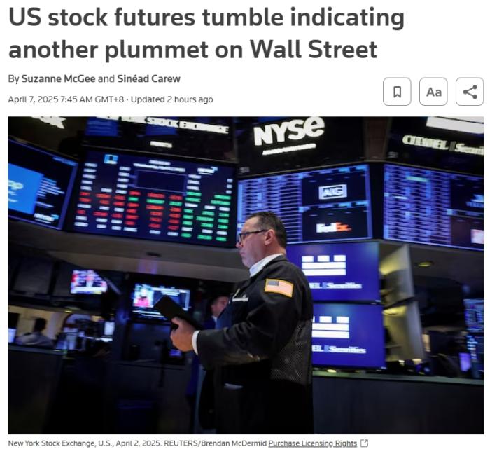 美東時(shí)間4月6日下午,美國(guó)股指期貨開盤暴跌,其中納斯達(dá)克100指數(shù)期貨在波動(dòng)中下跌約5.8%,標(biāo)普500指數(shù)期貨下跌約4.8%。美媒稱,當(dāng)前,關(guān)稅引發(fā)的市場(chǎng)混亂仍未結(jié)束,這對(duì)投資者乃至整個(gè)經(jīng)濟(jì)而言都是“不祥之兆”。
