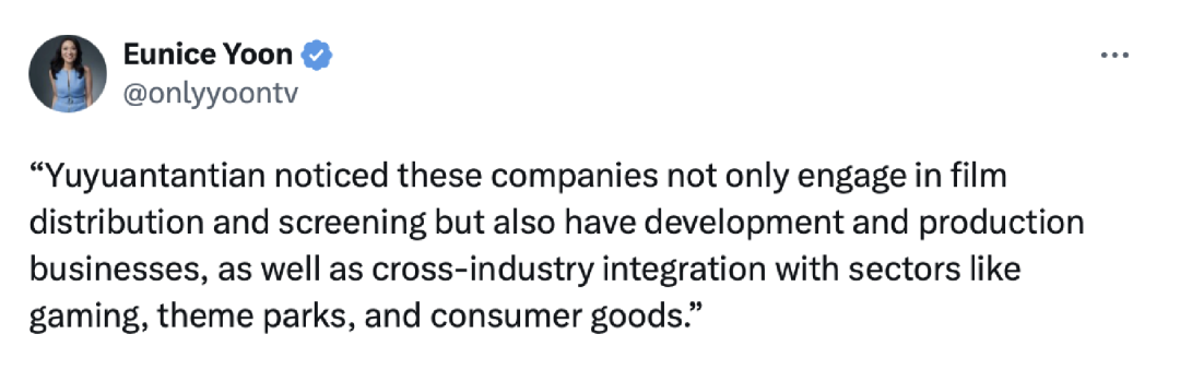 除此之外,譚主此前也就國(guó)家電影局的相關(guān)表態(tài)做過解讀。當(dāng)時(shí)就說了一個(gè)觀點(diǎn),如果中國(guó)消費(fèi)者開始在電影領(lǐng)域減少選擇美國(guó)產(chǎn)品,這種趨勢(shì)很可能會(huì)外溢到其他領(lǐng)域,很多國(guó)際媒體做了轉(zhuǎn)引。