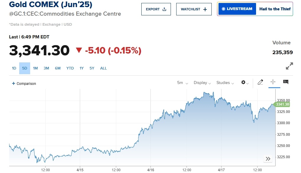 近期受美關(guān)稅政策影響,市場恐慌情緒蔓延,投資者投資策略偏向避險,進而拉升國際金價的走高。美東時間4月18日,美國紐約商品交易所6月黃金期貨價格收于每盎司3341.30美元,較前一日小幅下跌,但仍處于高位。