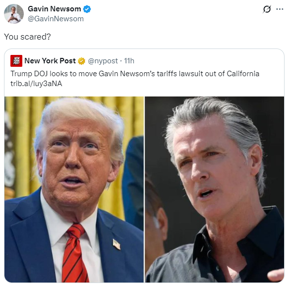18日,美國加州州長加文·紐森在社交媒體上發(fā)聲,他轉(zhuǎn)發(fā)了一則《紐約郵報》的新聞消息。這則新聞標題為《特朗普的司法部似乎希望把紐森關(guān)稅訴訟的審理地挪出加州》。紐森在轉(zhuǎn)發(fā)消息時附加了一句評論:“你害怕了嗎?”