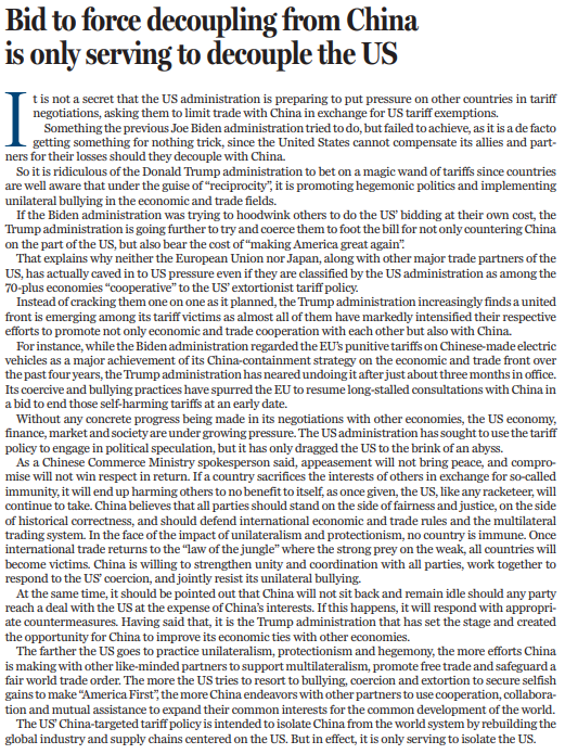 如中國商務部新聞發(fā)言人所說,綏靖換不來和平,妥協(xié)也得不到尊重。為一己一時私利,以損害別人利益來換取所謂豁免是與虎謀皮,最終只能是兩頭落空,損人不利己。中方認為,各方在“對等關稅”問題上應站在公平正義的一邊,應站在歷史正確的一邊,應捍衛(wèi)國際經(jīng)貿(mào)規(guī)則和多邊貿(mào)易體制。面對單邊主義和保護主義沖擊,誰都無法獨善其身。國際貿(mào)易一旦回歸弱肉強食的“叢林法則”,所有國家都會淪為受害者。中方愿與各方加強團結協(xié)調(diào),攜手應對,共同抵制單邊霸凌行徑,維護自身正當權益,捍衛(wèi)國際公平正義。